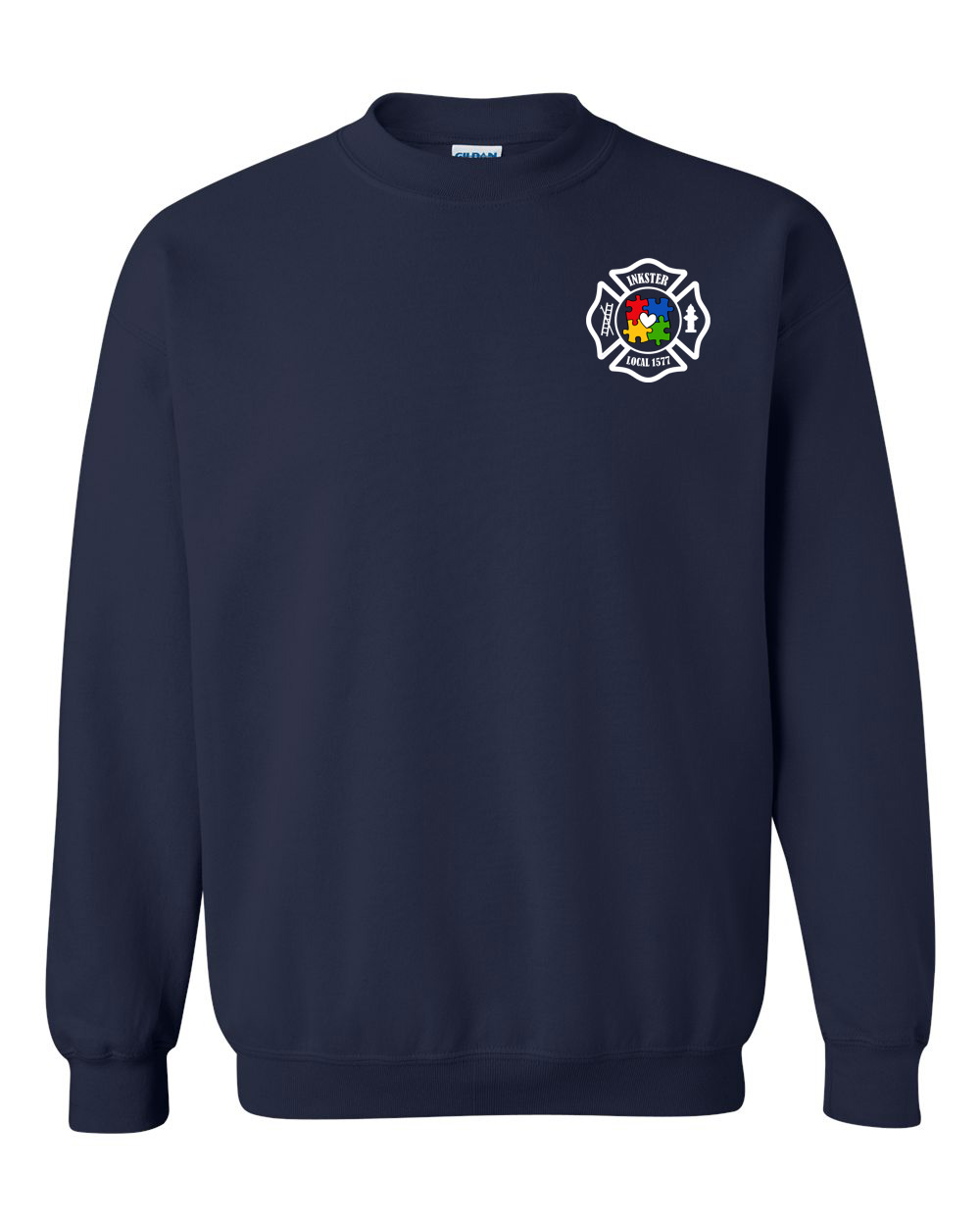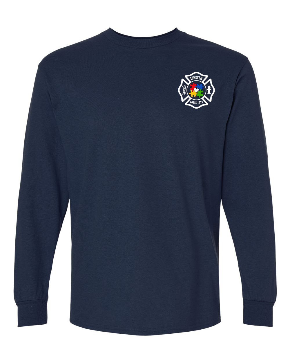 The navy garment provides strong contrast for the colorful autism awareness design.