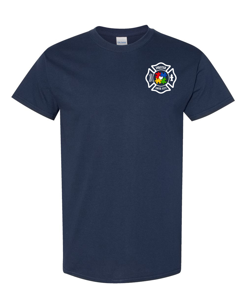 The design features bold autism awareness elements with a clean and professional layout printed on navy garments for strong contrast and visibility.